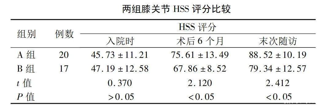 对照分析研究 6. 抗骨质疏松的比较骨质疏松治疗组(A组)和对照组(B组)通过膝关节HSS功能评分,两组入院时和膝关节置换术后6个月比较差异无统计学意义(P>0.05)末次随访时显着高于术前(t=,P<0.01),且A组优于B组(P<0.05)。