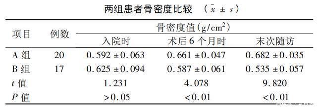 两组比较,A组有6例术后月度和末次随访复查时骨密度均高于B组,差异有统计学意义(P<0.01)。