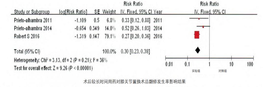 A Meta analysis 7 通过搜索(当时检索截止日期为 2016 年 2 月)PubMed、Cochrane Central、中国生物医学文献数据库等数据库,最终纳入 4 项队列研究和 1 项病例对照研究,全部为英文。以总样本量为例,结果表明实验组与对照组在膝关节置换术总翻修率上的差异具有统计学意义(RR=0.30,95%CI:),说明实验组组(膝关节置换术后长期规律性)抗成骨药物翻修发生率低于对照组。